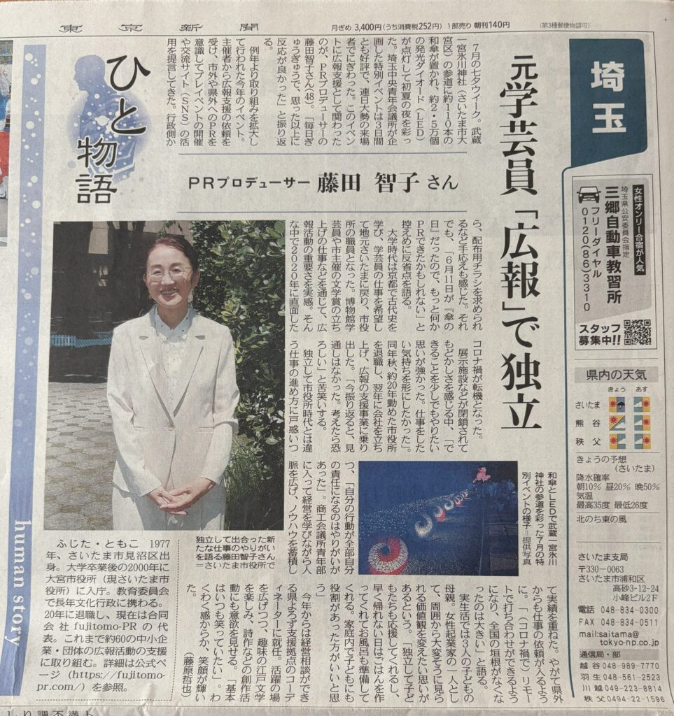 このたび、fujitomo-PR代表・藤田智子のこれまでの歩みや広報PRにかける思いが東京新聞埼玉版「ひと物語」にてご紹介いただきました。