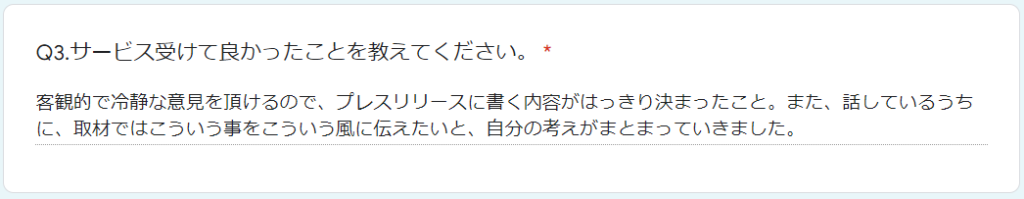 客観的で冷静な意見を頂けるので、プレスリリースに書く内容がはっきり決まったこと。